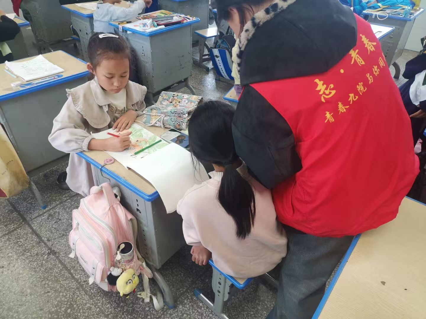 讲解并展示完相应PPT和简笔画图片后,便到了实操部分。面对动手能力较弱的孩子们,志愿者们化身“手把手小老师”,耐心细致地进行分析指导,从握笔姿势到涂色技巧,不厌其烦地示范;当孩子产生畏难情绪时,他们及时送上鼓励:“你画的线条很流畅,大胆一点,你的想法非常棒!”一句句温暖的劝诫与肯定,像一束束光,驱散了孩子们的胆怯。渐渐地,教室里的画笔声越来