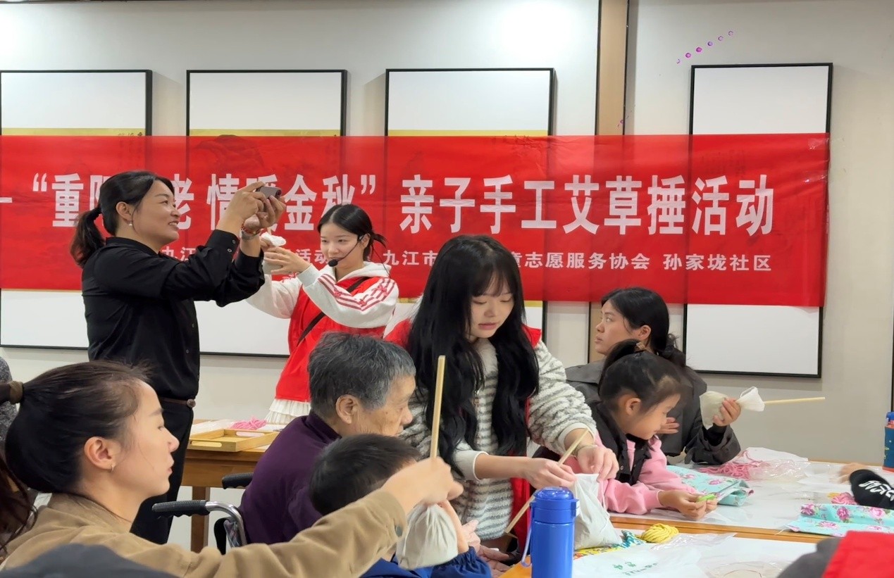志愿者与老人一同参与手工制作,老人虽行动不便却也兴致盎然,志愿者耐心陪伴、细致协助,旁边的家庭也其乐融融地投入其中,整个场景传递出敬老爱老、亲子共乐的暖心氛围,让传统节日的温情在每一个角落流淌。