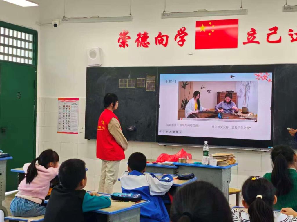 课堂上,志愿者以古筝演奏视频为切入点,引导孩子们观察传统乐器的演奏形式,并通过“速度感知”“情感体验”的小提问,带领学生感受国风音乐的舒缓韵律与静谧氛围,在互动中播撒传统文化的种子。