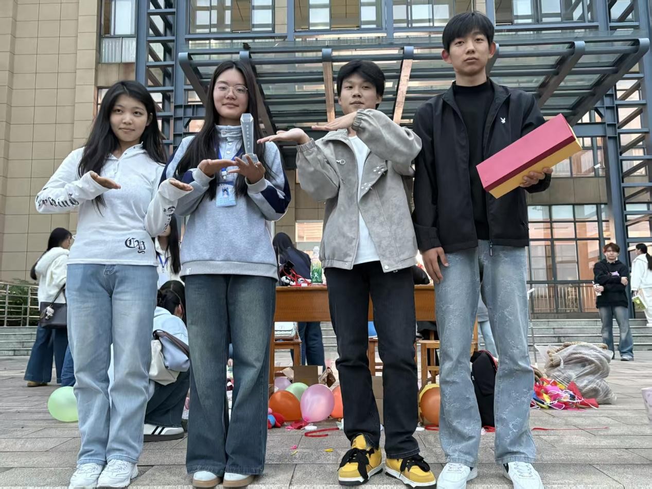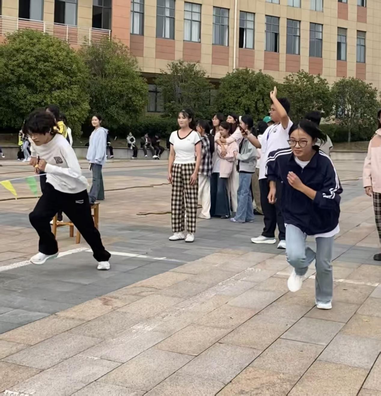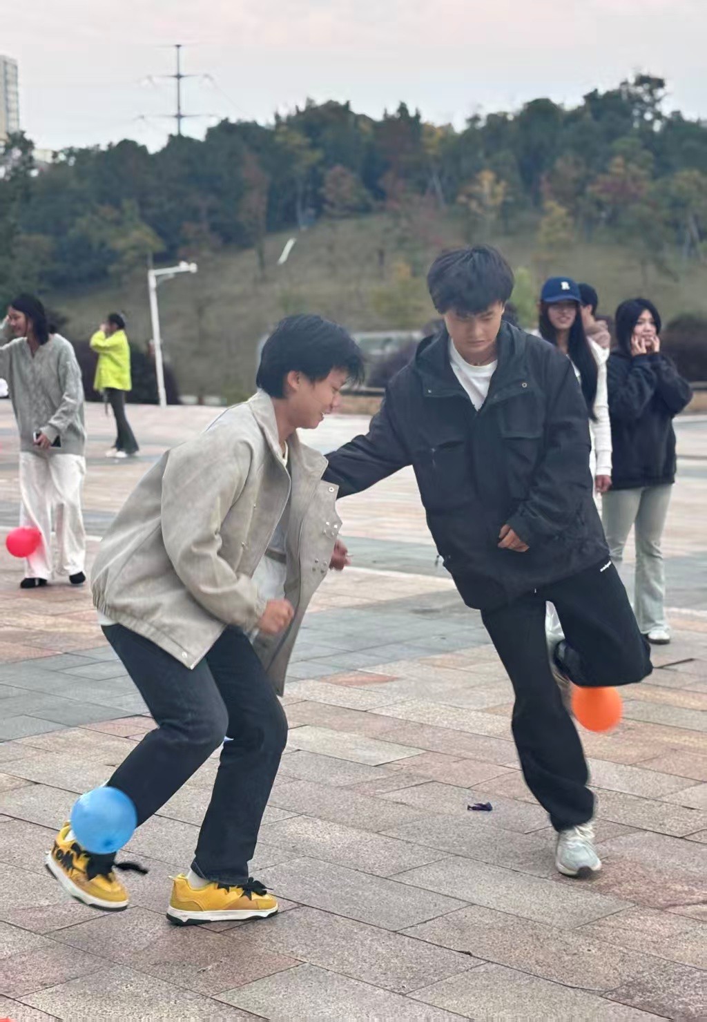 踩气球——欢乐与策略并存,3点10分,踩气球项目将运动会的趣味性发挥到极致。每位参赛选手脚踝上绑着两个气球,既要保护自己的气球不被踩破,又要想方设法去踩破对手的气球。艺术楼门口的大理石地面上,大家时而小心翼翼地躲避,时而机智地围追堵截。气球爆裂的“砰砰”声与同学们的笑声交织在一起,仿佛一场热闹的庆典。有的同学为了保护气球,干脆抱起双脚跳着走,惹得全场大笑。这个项目不仅让大家在追逐中释放了压力,也在不知不觉中拉近了彼此的距离。