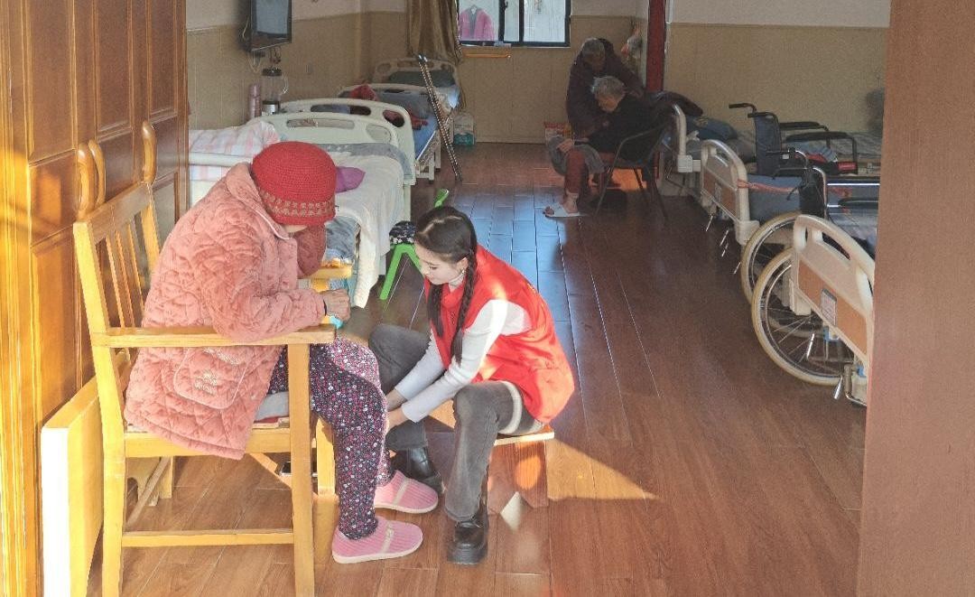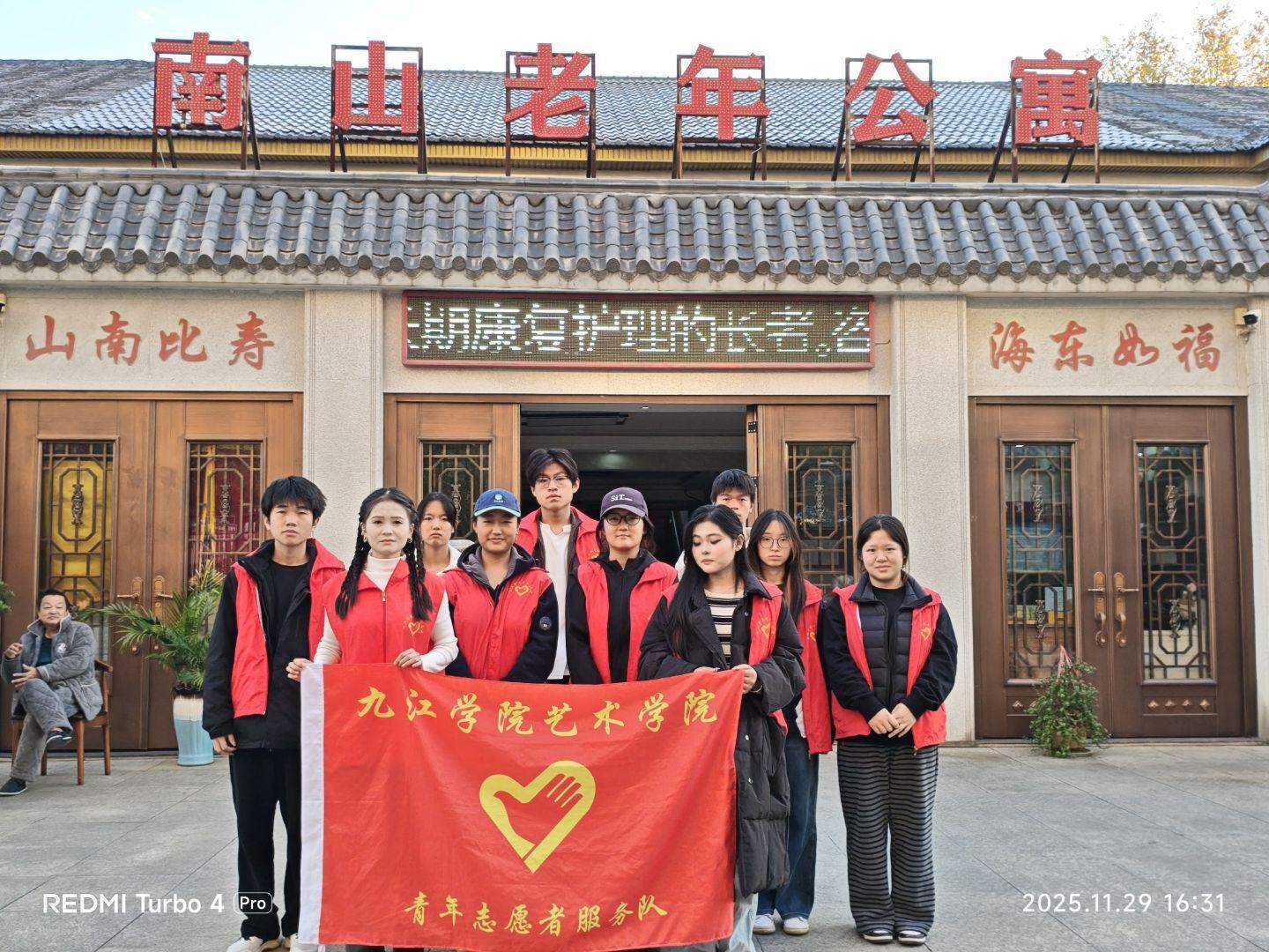 冬日的暖阳穿透云层,为南山老年公寓的青瓦白墙镀上了一层柔和的光晕。2025年11月29日下午14:30,九江学院艺术学院青年志愿者服务队身着统一红马甲,走进这座充满岁月气息的院落,以陪伴与服务为纽带,开展了一场温馨十足的志愿活动。