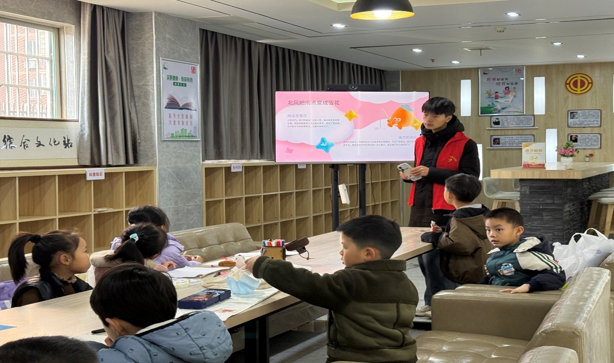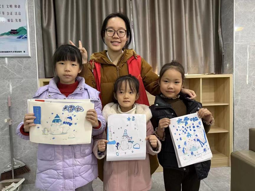 2025年12月7日,九江学院艺术学院青年志愿者服务队走进宋家牌社区,以二十四节气中的“大雪”为主题,开展了一场集知识普及、艺术创作与文化体验于一体的志愿服务,为社区儿童带来了一场生动而温暖的冬日文化课堂。