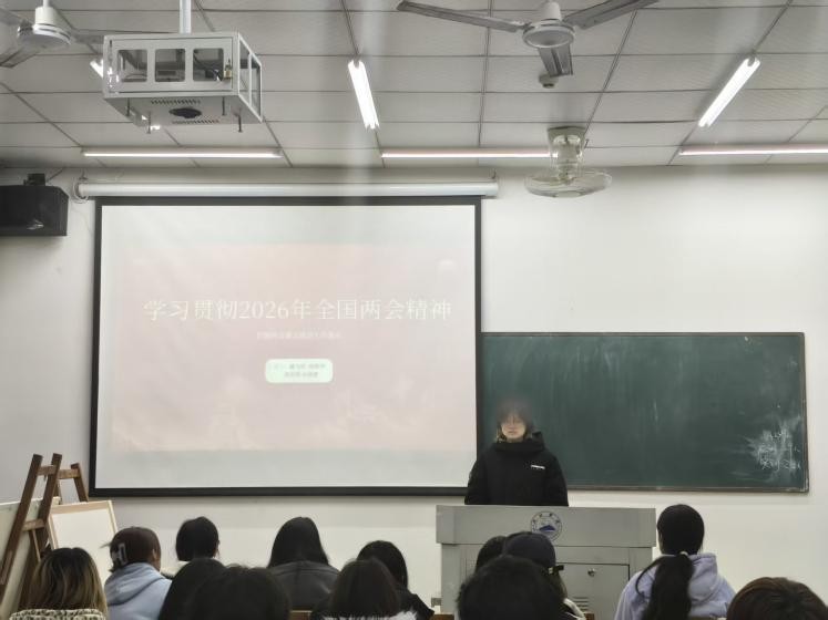 团课期间,各班团支书充分发挥骨干作用,提前认真学习领会两会精神核心要义,结合艺术专业学生特点,精心准备了讲解内容。课堂上他们通过PPT演示、要点梳理等方式,带领同学们回顾了2026年全国两会的基本概况和主要议程,重点围绕政府工作报告中关于文化建设、科技创新、教育发展、青年就业等方面的部署要求进行了深入浅出的解读。团支书们将宏观政策转化为贴近学生实际的生动语言,帮助同学们更好地理解国家发展方向与个人成长的密切关联。