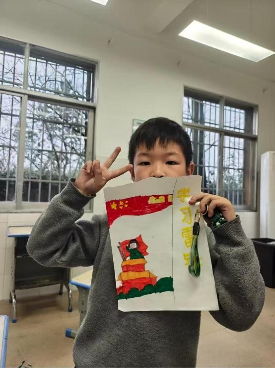 在美术创作环节,志愿者们结合雷锋精神主题, 分年级开展特色美术课程, 引导孩子们用画笔表达对雷锋精神的理解。以雷锋形象、爱国主题为创作内容,志愿者手把手指导孩子们勾勒轮廓、填充色彩, 让孩子们在创作中感悟雷锋精神的力量。孩子们专注创作, 一幅幅充满童真的画作跃然纸上:有的描绘雷锋同志助人为乐的身影,有的画出天安门与雷锋形象的结合,用色彩与线条诉说对雷锋精神的崇敬。