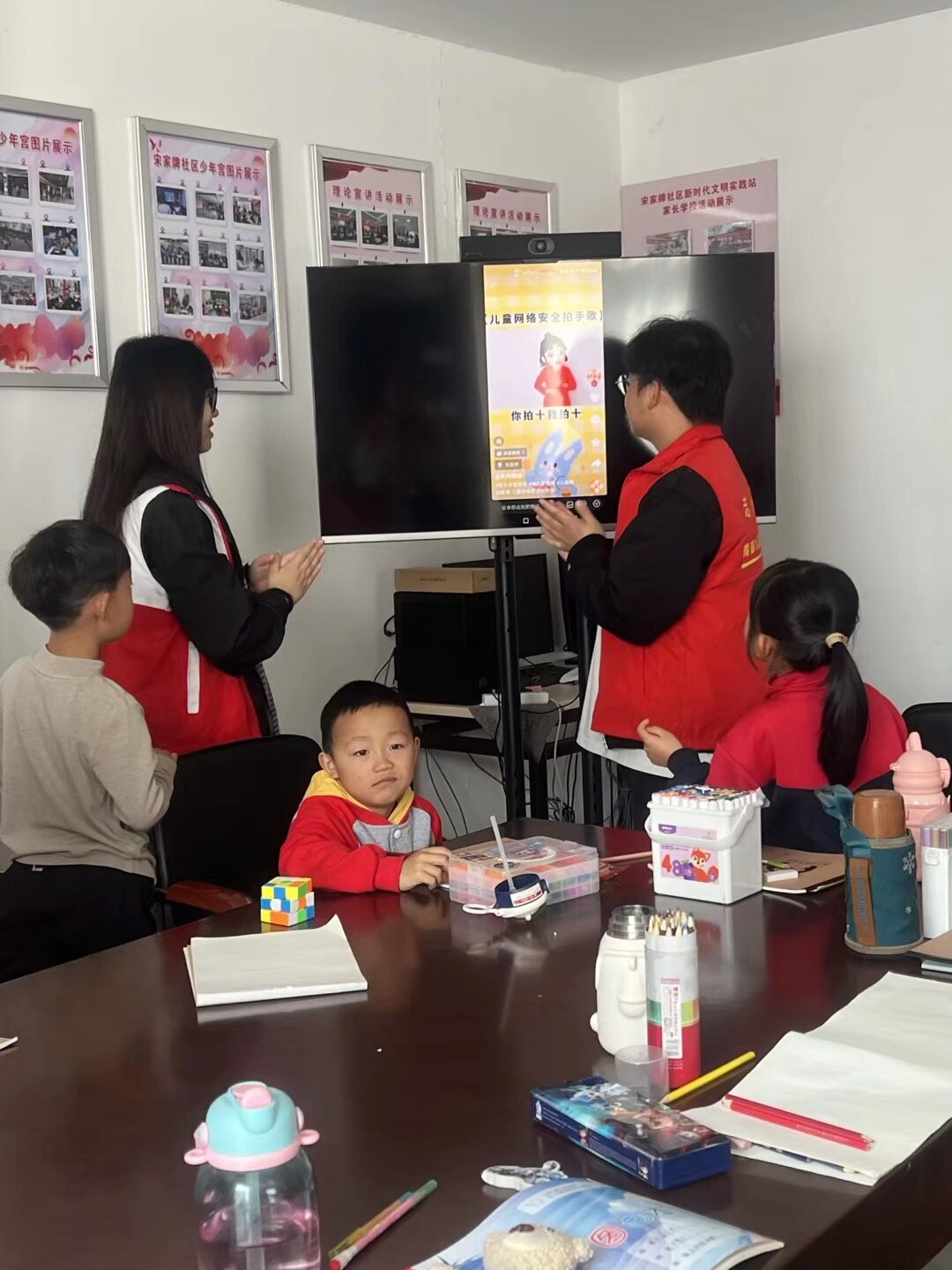 随后的手势舞环节,志愿者们带领孩子们学习趣味手势舞,将欢快的旋律与灵动的手势动作相结合。志愿者们先逐句分解动作,手把手纠正孩子们的姿势,用活泼的语气引导大家跟上节奏,孩子们跟随着旋律认真模仿,抬手、摆臂、合手,动作整齐又可爱。教室里歌声阵阵、笑语盈盈,孩子们在轻松的互动中感受律动之美,在彼此的配合中体会协作的快乐,现场氛围热烈又温馨。