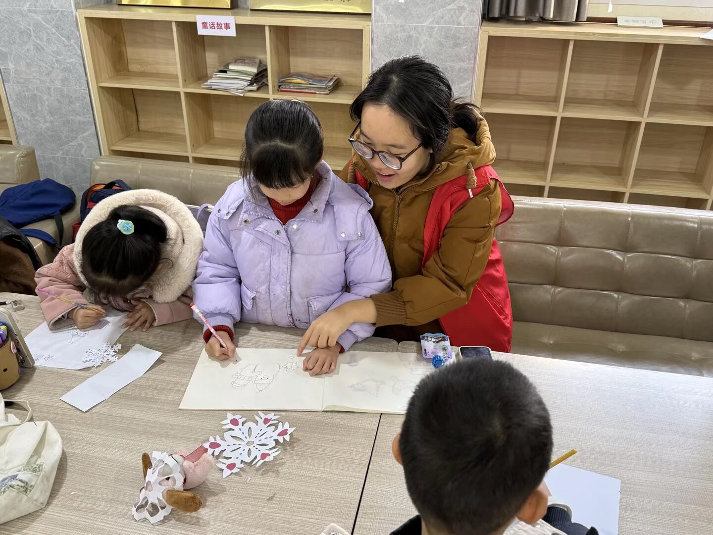 活动伊始,志愿者们带来了生动有趣的简笔画教学。结合孩子们的兴趣喜好,志愿者们以可爱的卡通形象、春日花草、萌趣小动物为创作素材,用简单易懂的方式讲解线条勾勒、造型搭配的小技巧。课堂上,志愿者们俯身相伴,手把手指导孩子们握笔、构图,耐心解答创作中的疑问,鼓励孩子们大胆发挥想象。孩子们专注落笔,在画纸上勾勒出属于自己的创意作品,一张张稚嫩的画作,满是童真与巧思,在动手创作中感受美术的独特魅力。