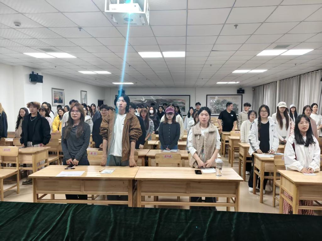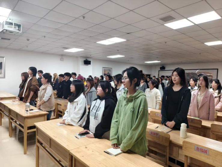 团课伊始,全体入团积极分子肃立齐唱国歌。“起来,不愿做奴隶的人们……”激昂的旋律在教室内回荡,同学们神情庄重,目光坚定。虽然没有音响伴奏,但每个人的歌声都饱含力量,从胸腔中自然迸发。这一刻,爱国之情在整齐的合唱中无声传递,也为整堂团课奠定了庄严而热忱的基调。