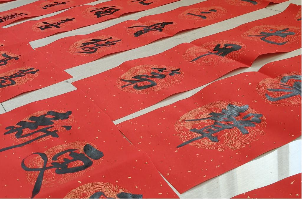 上午9时起,老师们陆续来到活动现场。绘画教研室内暖意融融,长桌铺开,红纸砚台齐备。教研室的书法老师们挥毫泼墨,笔走龙蛇,一副副饱含祝福的春联、一张张气韵生动的“福”字跃然纸上,或苍劲有力,或秀逸灵动,引得在场老师连连称赞。大家或驻足欣赏,或精心挑选心仪的联句,或与书写老师交流切磋,现场气氛热烈而融洽。