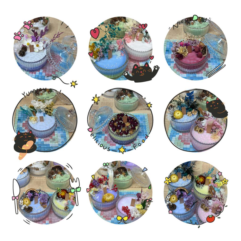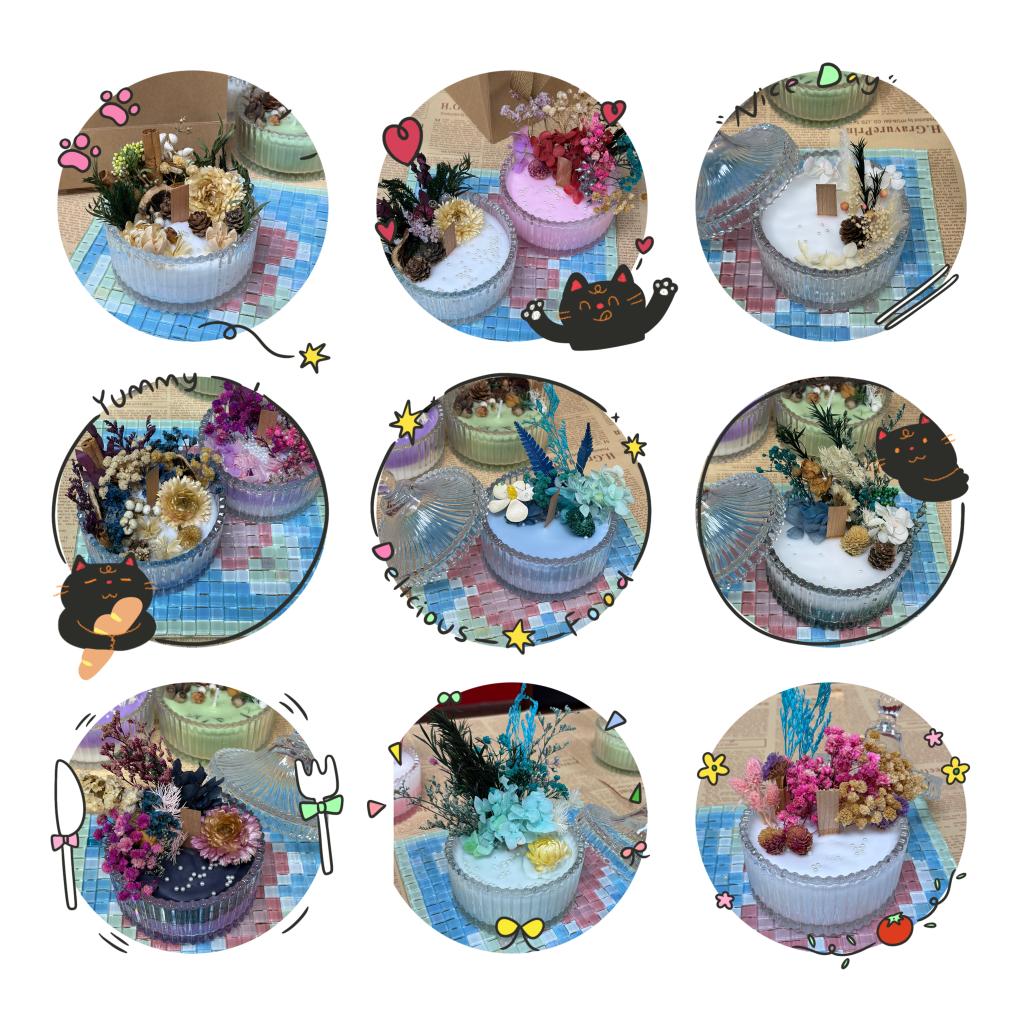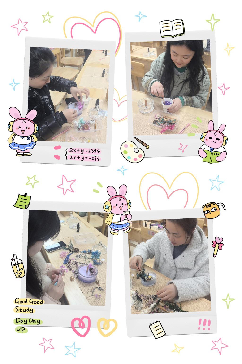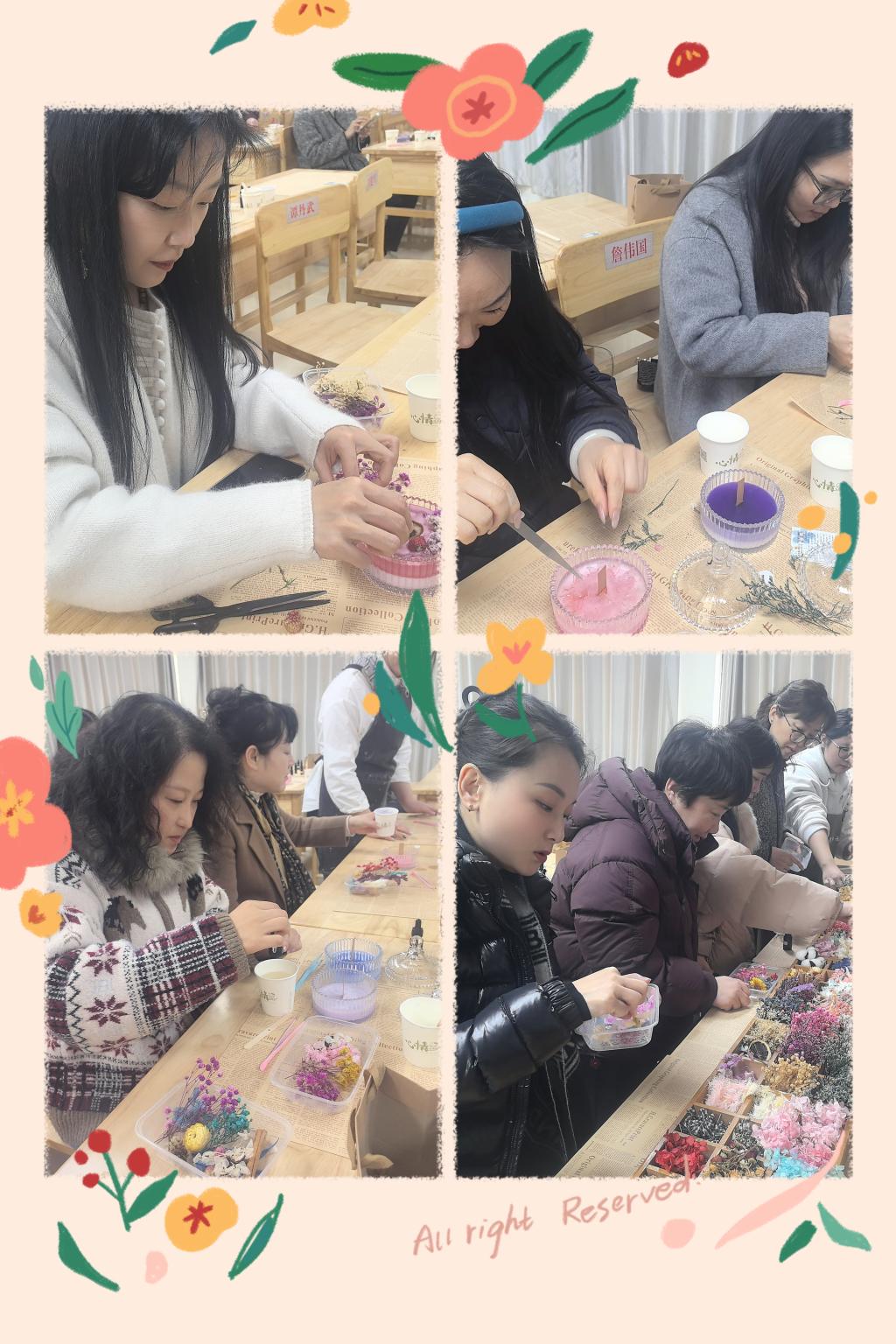 活动现场布置得温馨雅致,暖黄的灯光搭配四处点缀的干花,让整个空间都氤氲着温柔的氛围。老师们围坐在一起,在专业手作老师的指导下,从挑选干花、加热蜡材,到小心翼翼地将花朵装饰在蜡杯中,再等待蜡液慢慢凝固成型,每一步都饱含着巧思与心意。